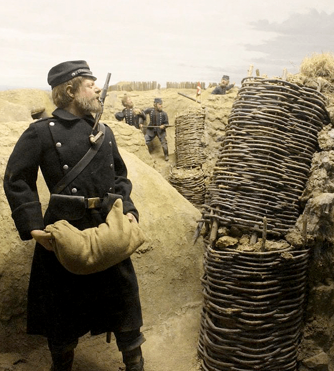 En dansk infanterist i skyttegravarna vid Dybbøl. Vaxdocka på Historiecenter Dybbøl Banke. Foto: Magnus Glenning.
